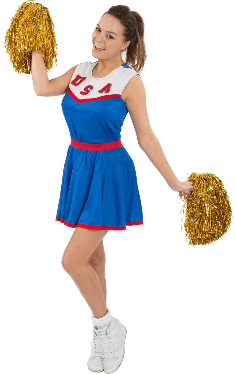 Cheer on the home team in our vibrant American Cheerleader Costume! This stunning blue and red outfit even includes a pair of tinsel pom poms, adding a touch of sparkle to this fantastic fancy dress idea.