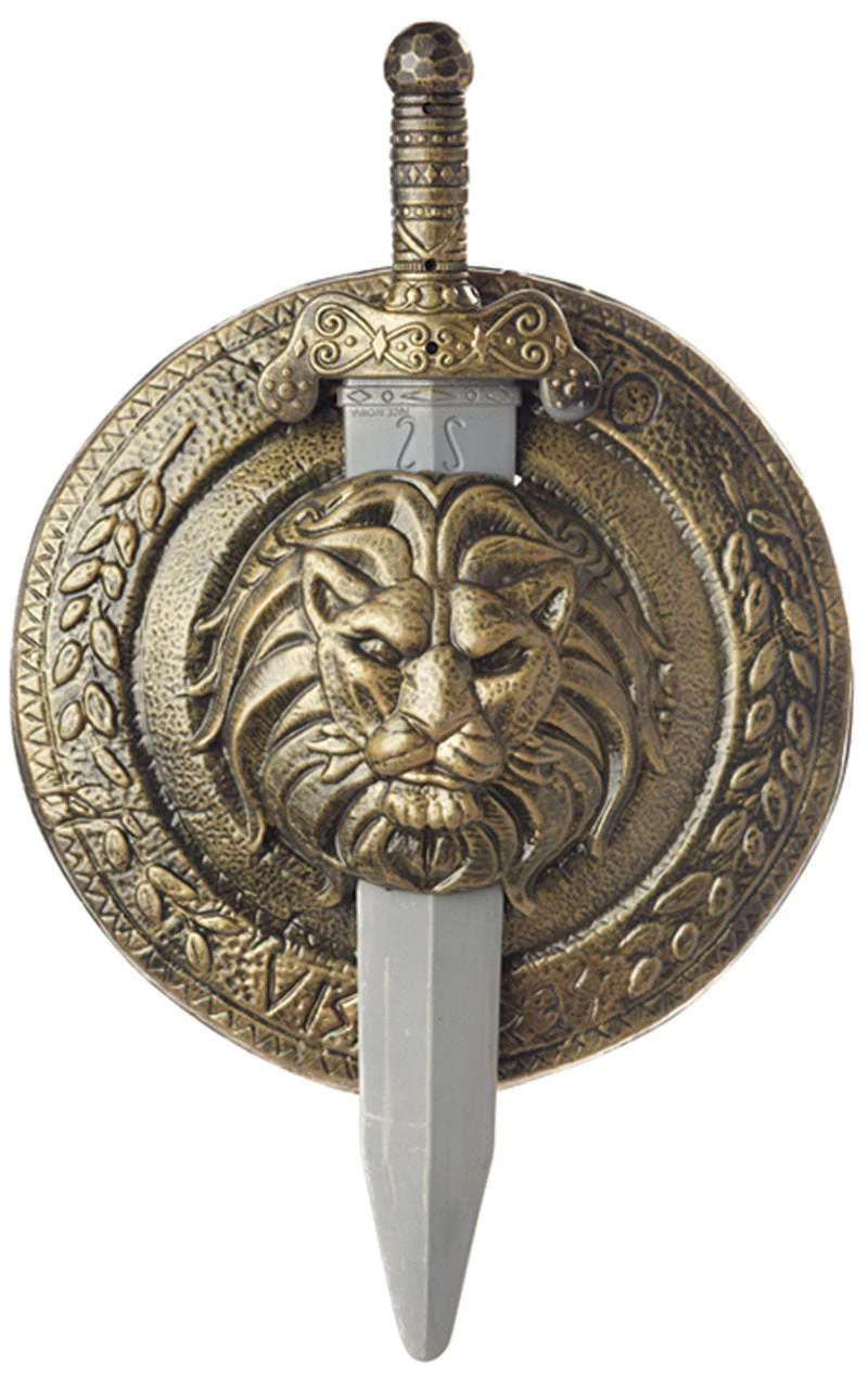 Gold coloured shield with lion detail and sword. Shield measures 18″ in diameter.