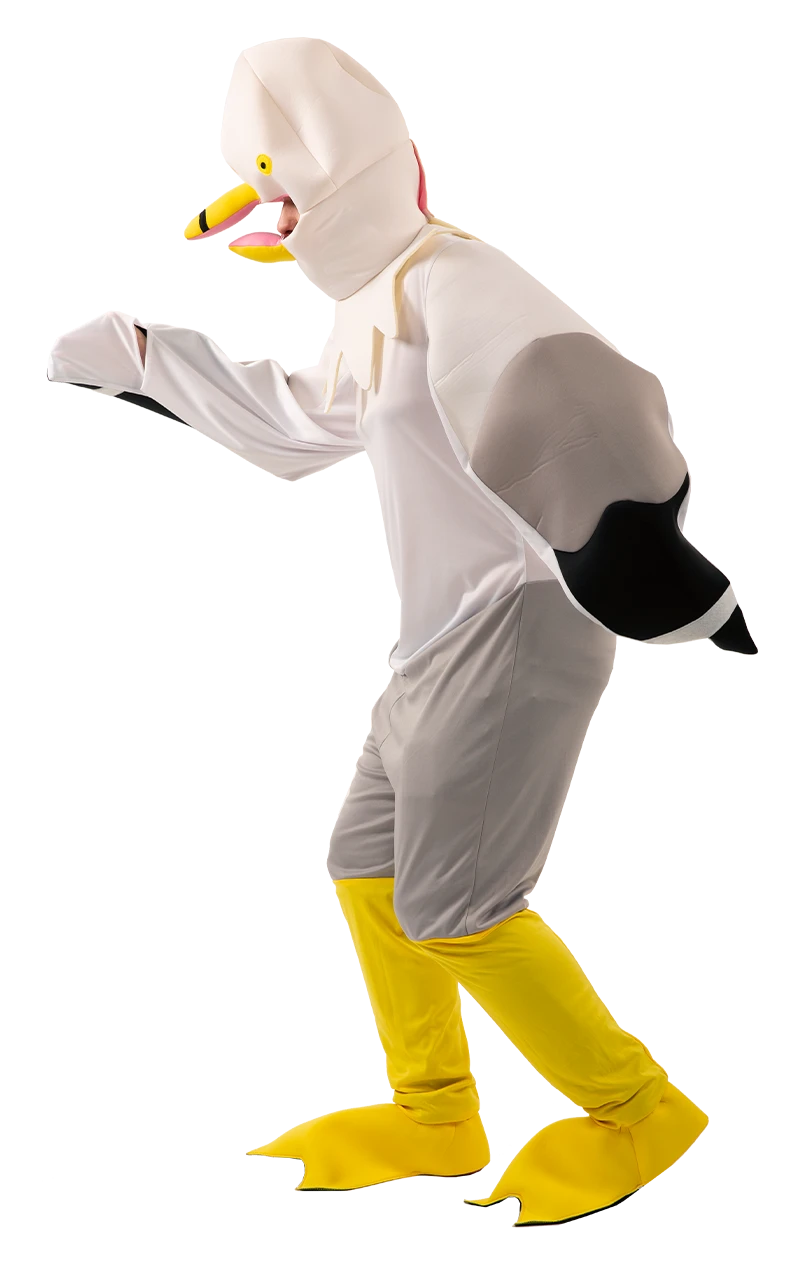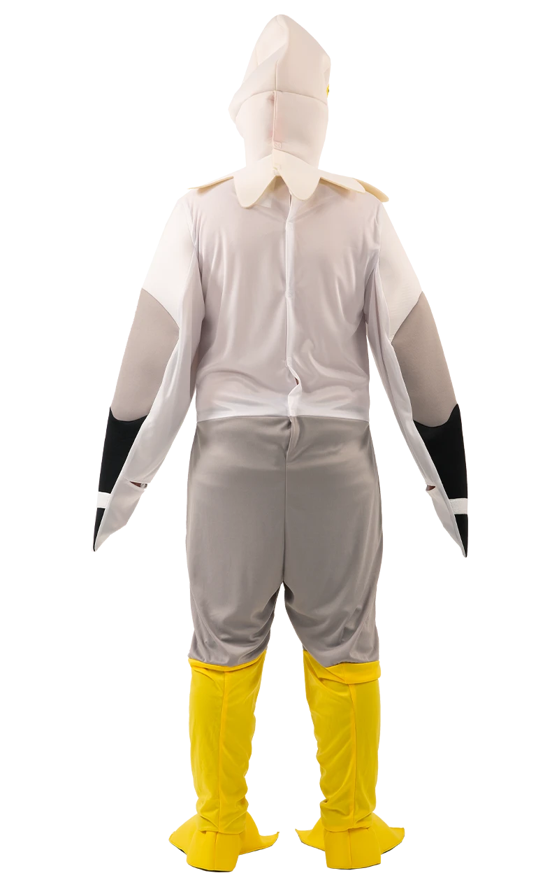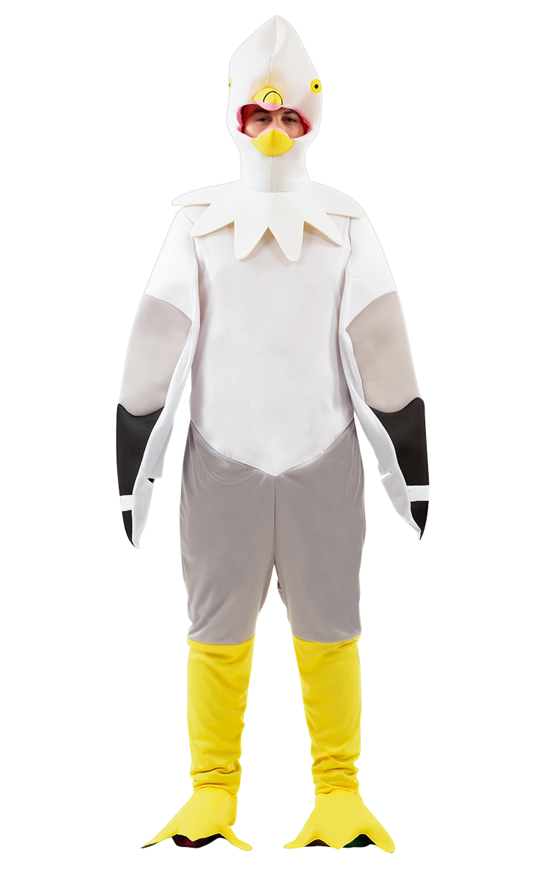 This Adult Seagull Costume is a full bodysuit that features large wings for arms, yellow legs with webbed feet, and a white upper part to represent bird’s plumage.