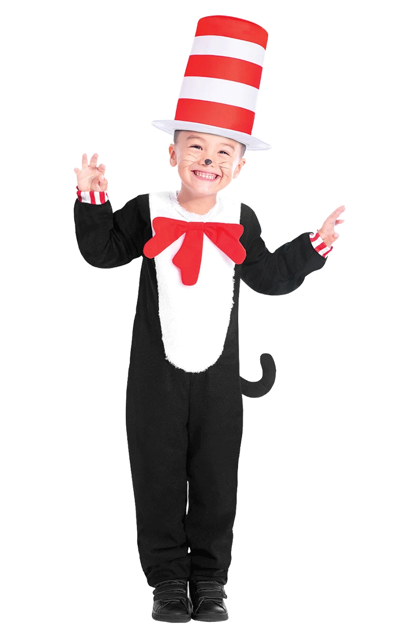Featuring a cosy black furry jumpsuit with a white fur belly, an attached bow tie and tail, and his iconic oversized striped hat, your child will certainly stand out this World Book Day!
