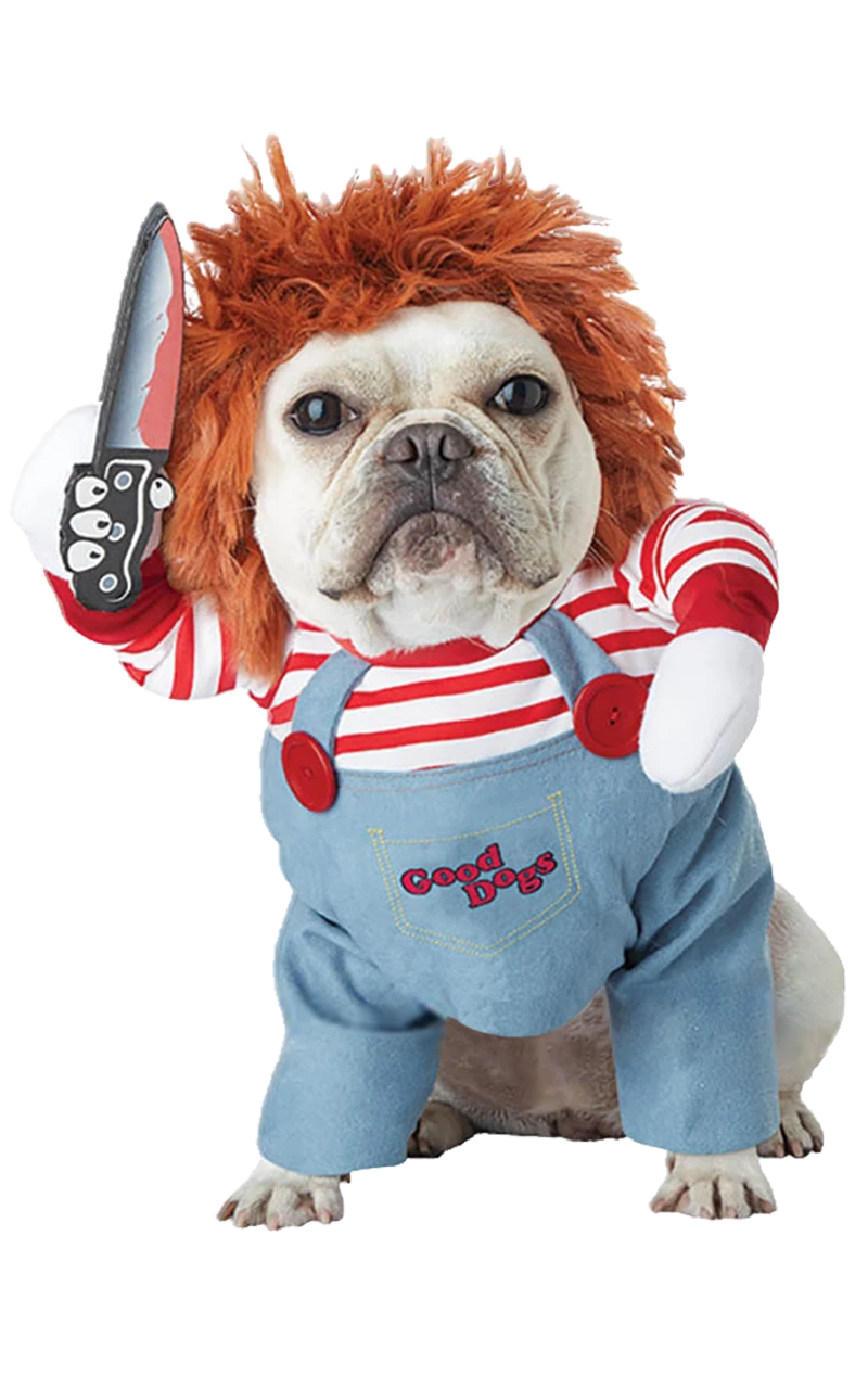 Turn them into a horror killer dog with our Chucky Dog Costume, complete with a bloody foam knife, wild orange wig, and a Chucky dungarees bodysuit.