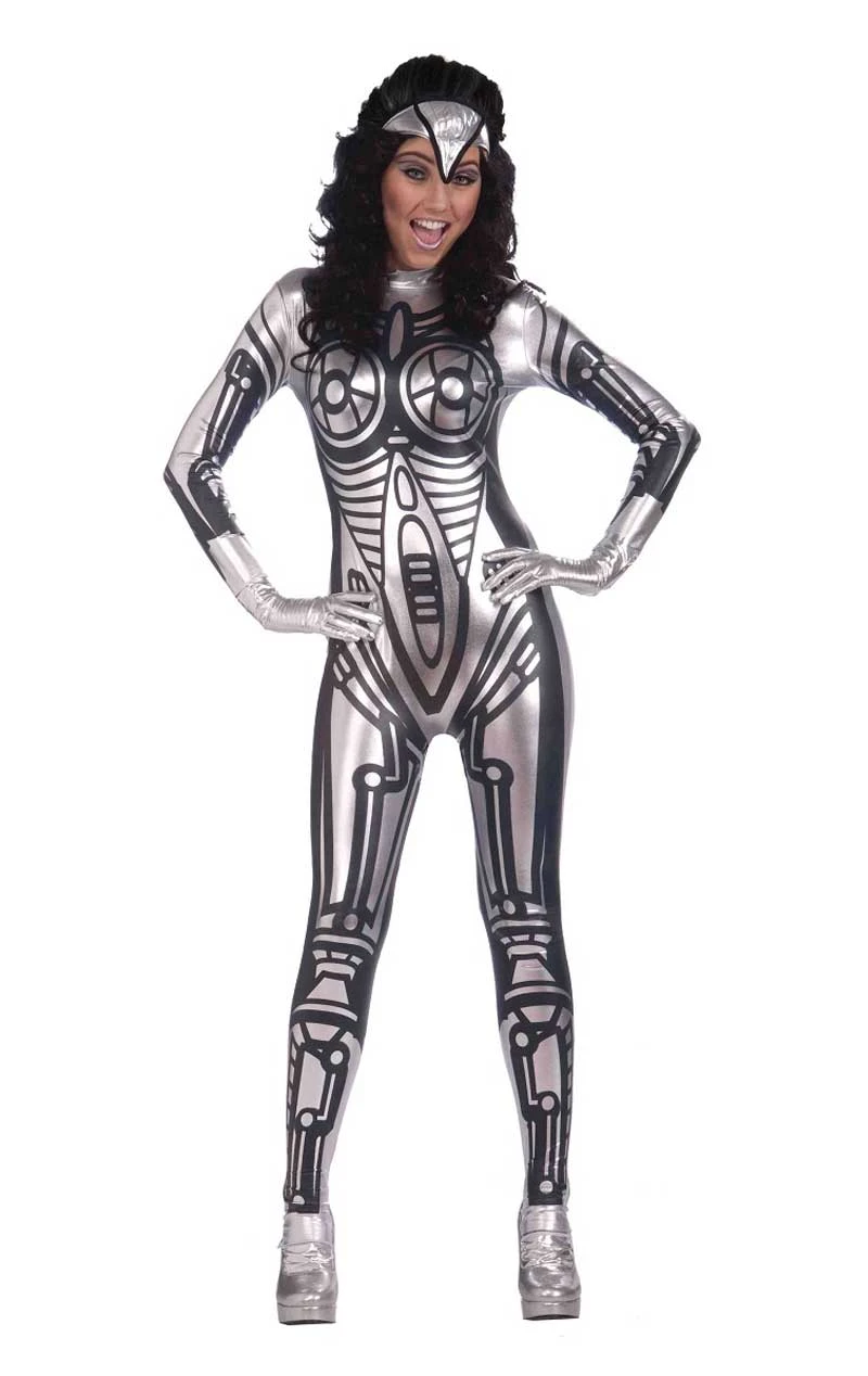 The Female Robot Costume includes a silver jumpsuit printed with black mechanical parts.