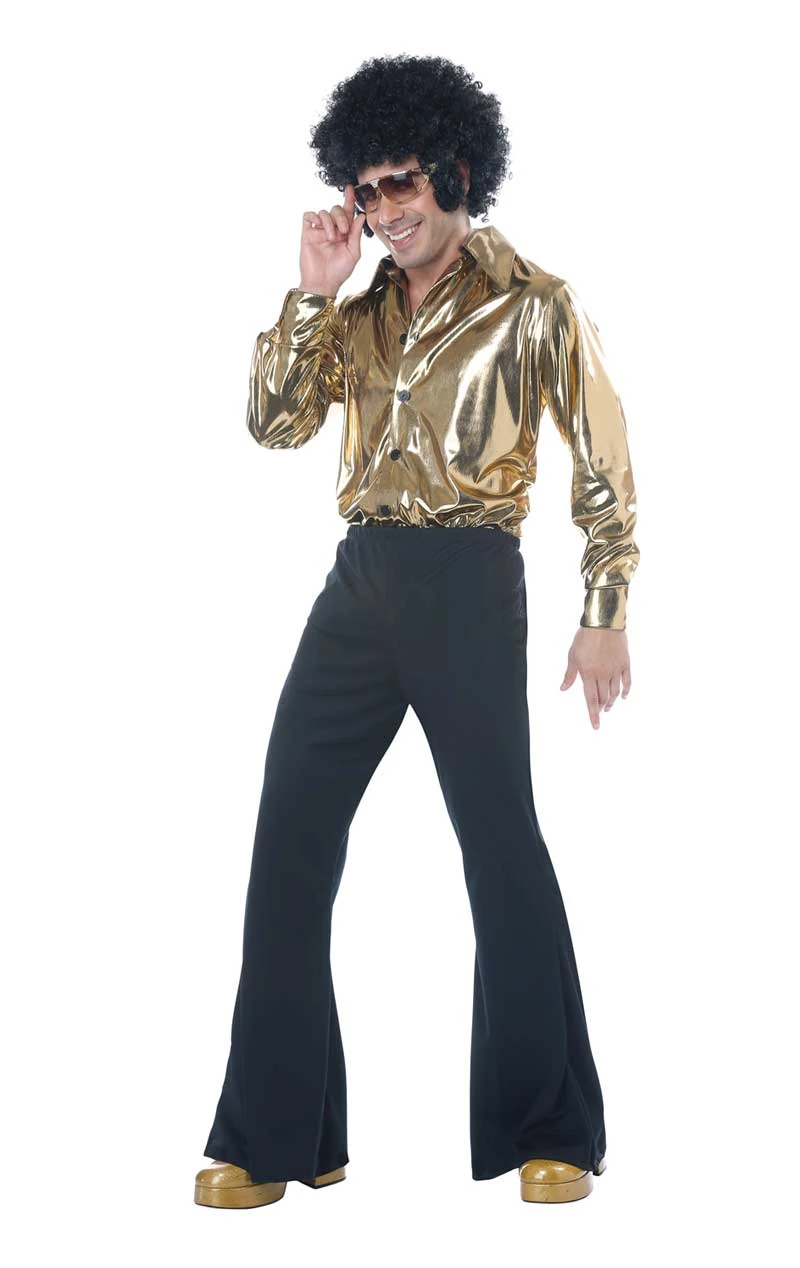 The Mens Disco King Costume comes complete with a bright and vibrant gold shirt. It features a button front opening that can be fastened up or left un-open if you want to show a bit of chest hair. Also included is a pair of flared black trousers that are tight around the waist and begin to flare out from the knees.