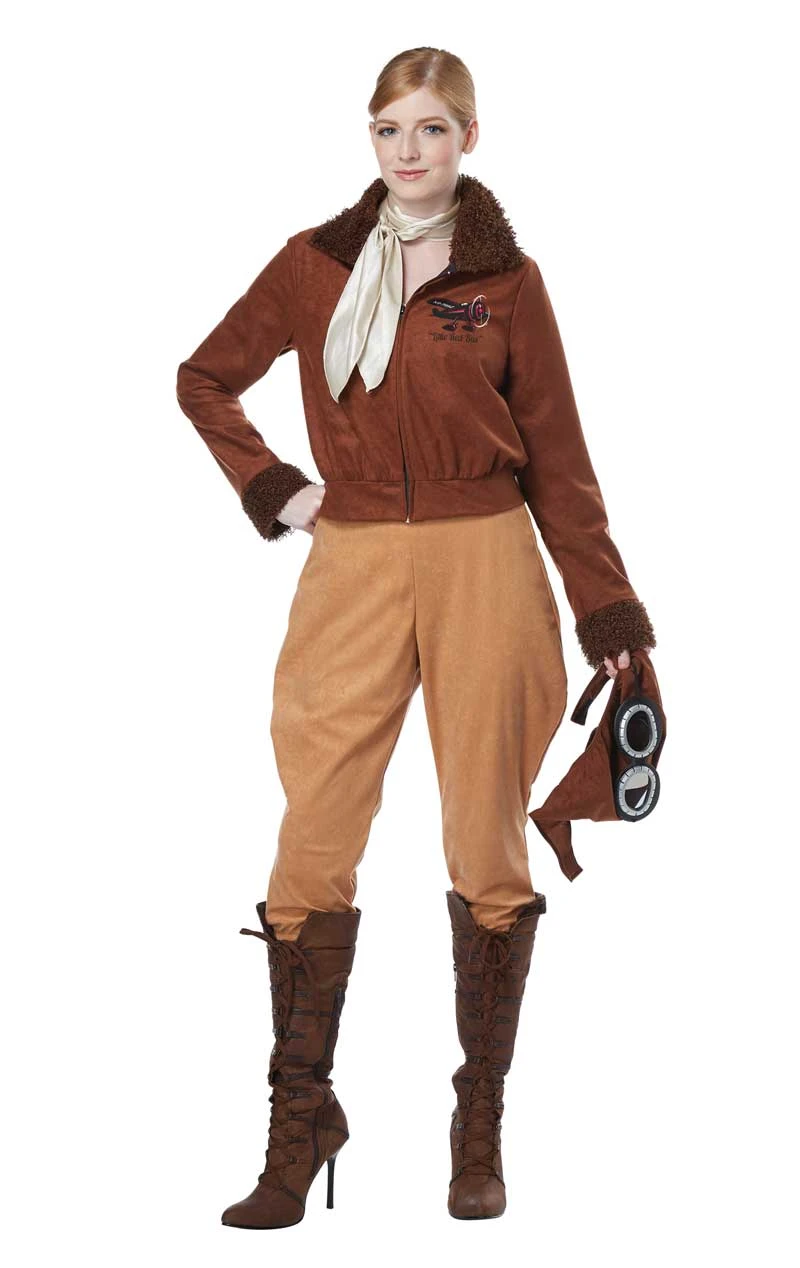 The Womens Amelia Earhart Aviator Costume comes complete with dark brown, leather style aviator jacket with faux fur detailing on the sleeves and collar. Also included is a pair of beige trousers, a cream coloured scarf to tie around the neck, a brown aviator hat, and a pair of transparent googles.