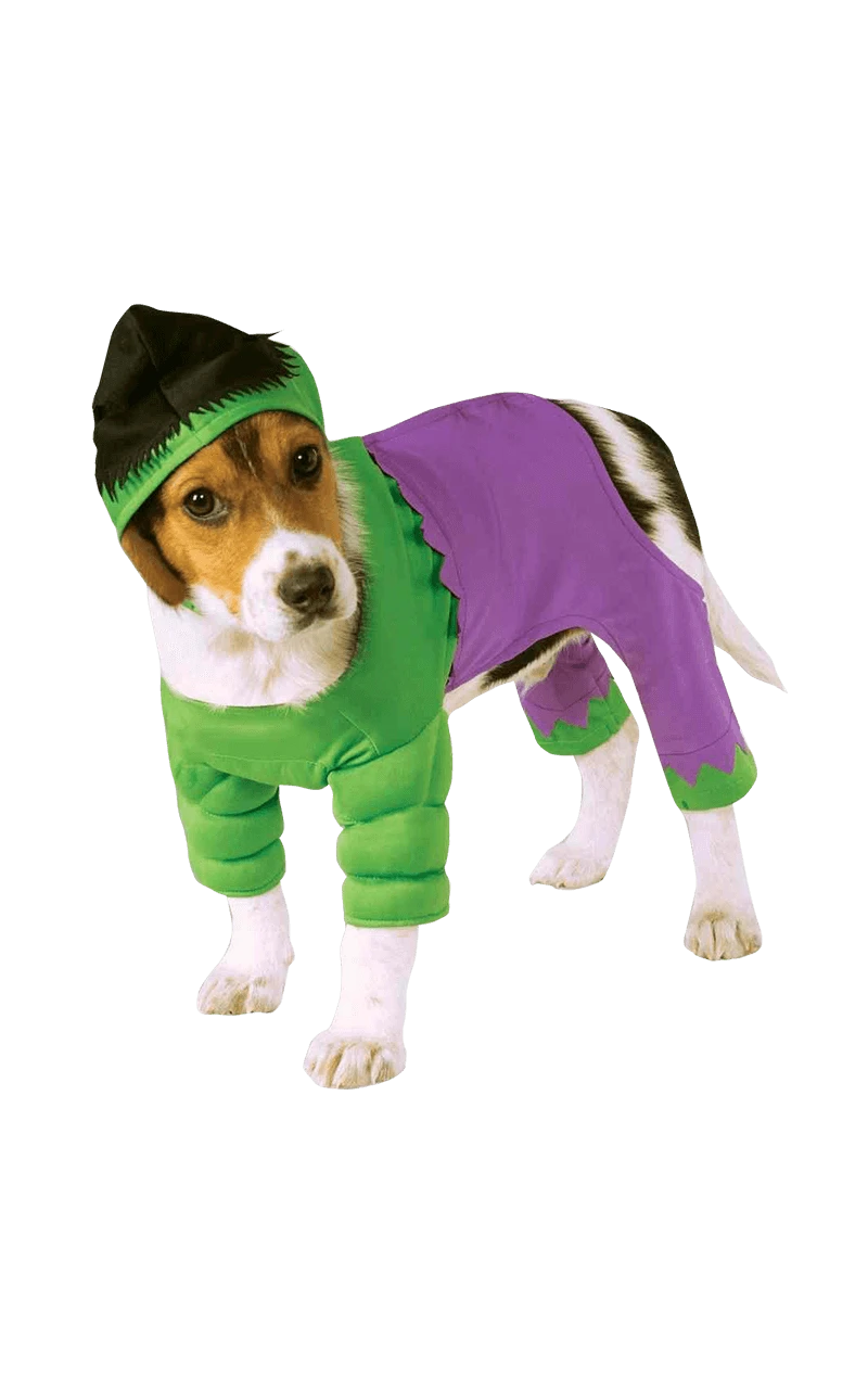 Give your dog an angry green look and some incredible strength in this funny superhero dog costume.