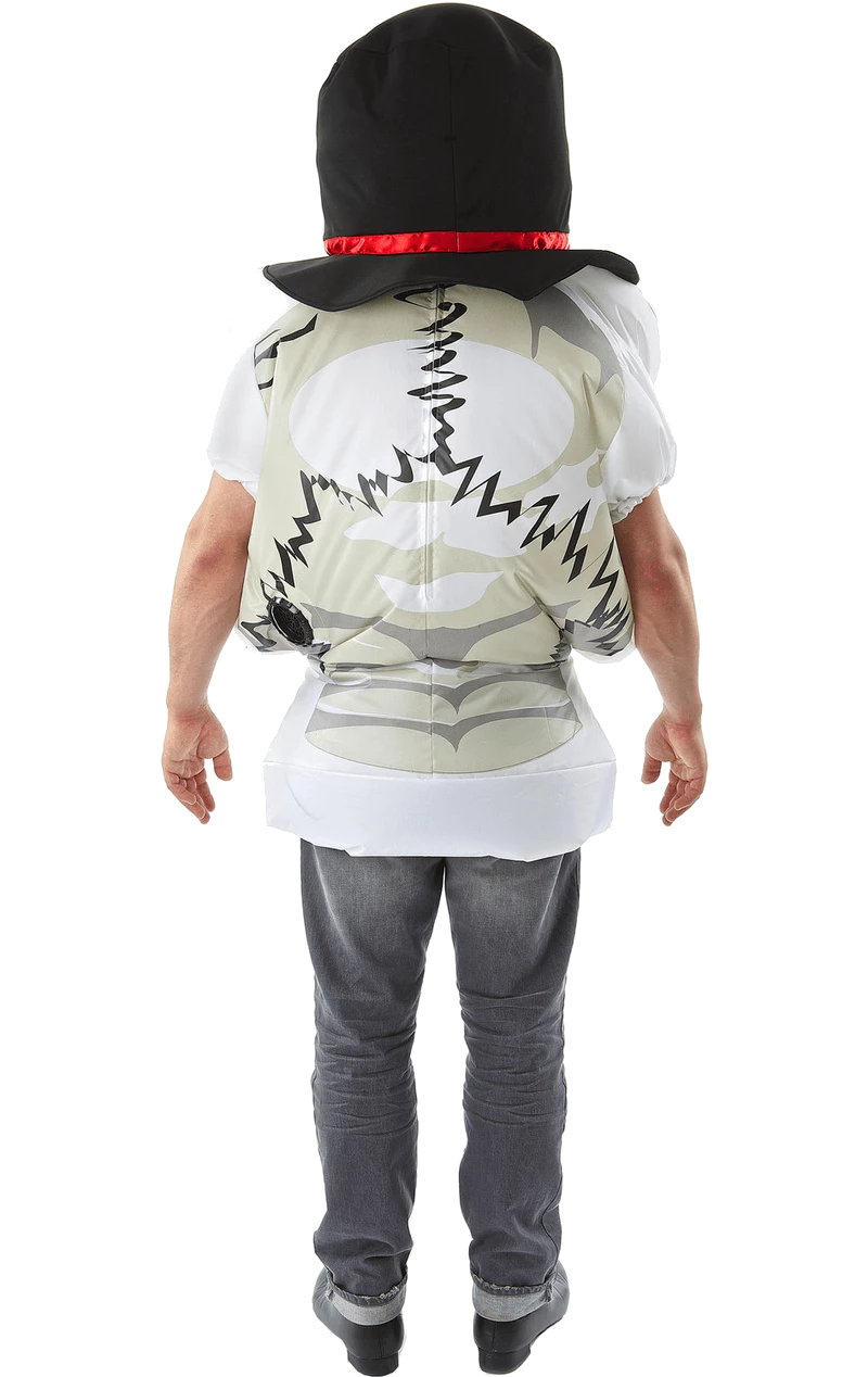 An oversized black hat with a red band provides a finishing touch to the skull, concealing your face while allowing you to see through a mesh patch at the front. The skull is inflated by a small fan which attaches to the costume at the waist and has a battery pack that clips on your waistband or belt.