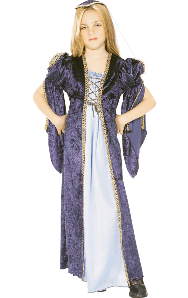 Our Kids Juliet Costume includes a long blue velvet effect dress with a gold brocade trim and laces up at the front, transforming the wearer into the Capulet daughter.