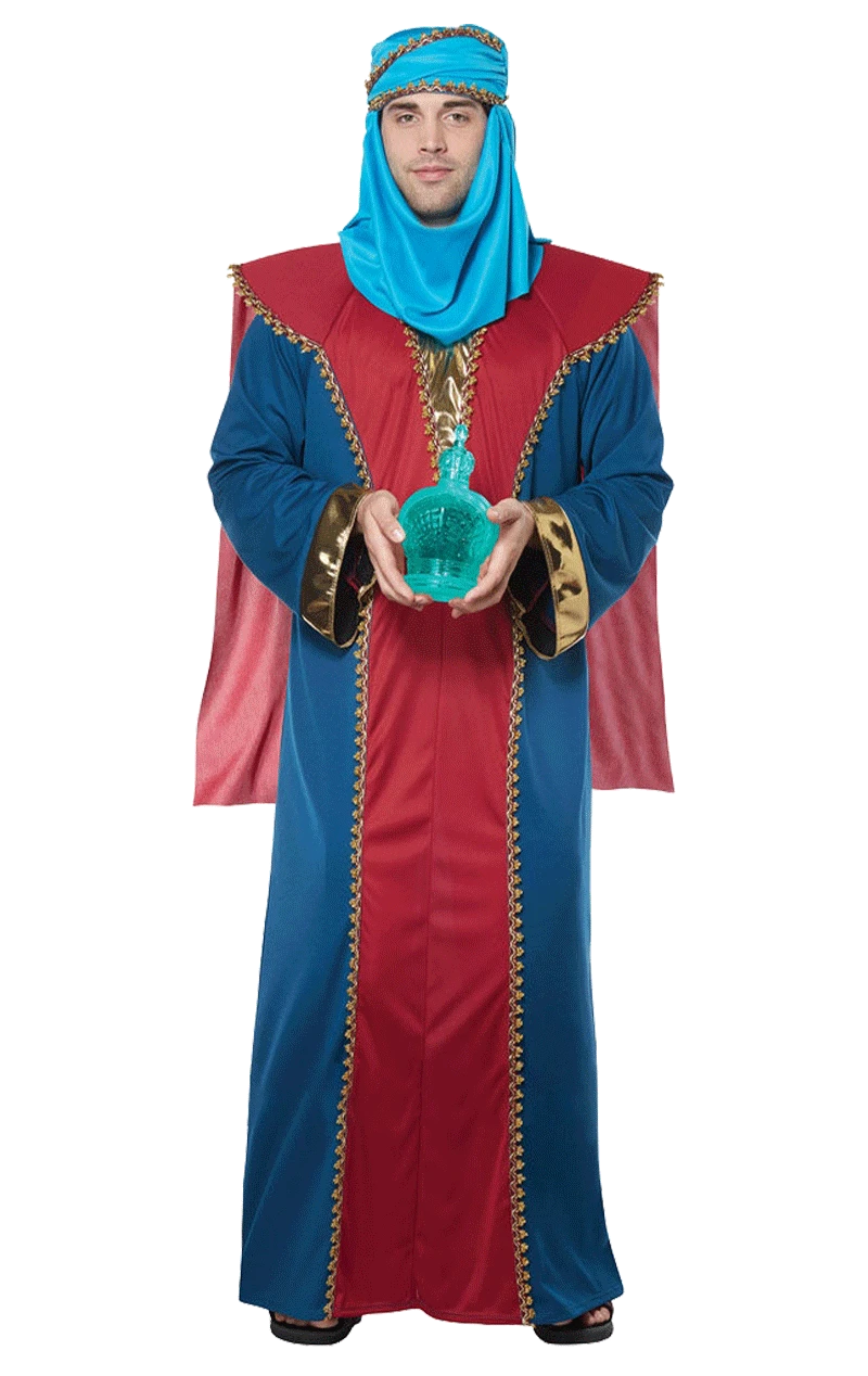 Become the King of Arabia for the Christmas nativity show with this regal and traditional Mens Balthazar Wise Man Costume. In this nativity-inspired robe, cape and turban, you’ll look the part as you give the gift of myrrh to baby Jesus.