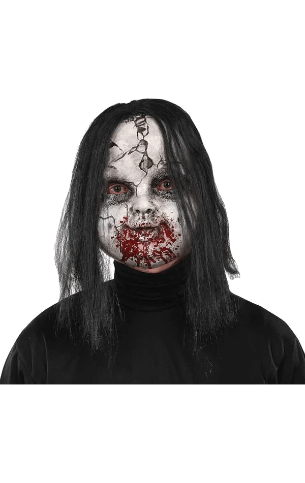 Our Adult Halloween Terror Tot Facepiece is a seriously creepy baby doll face facepiece with black synthetic hair.