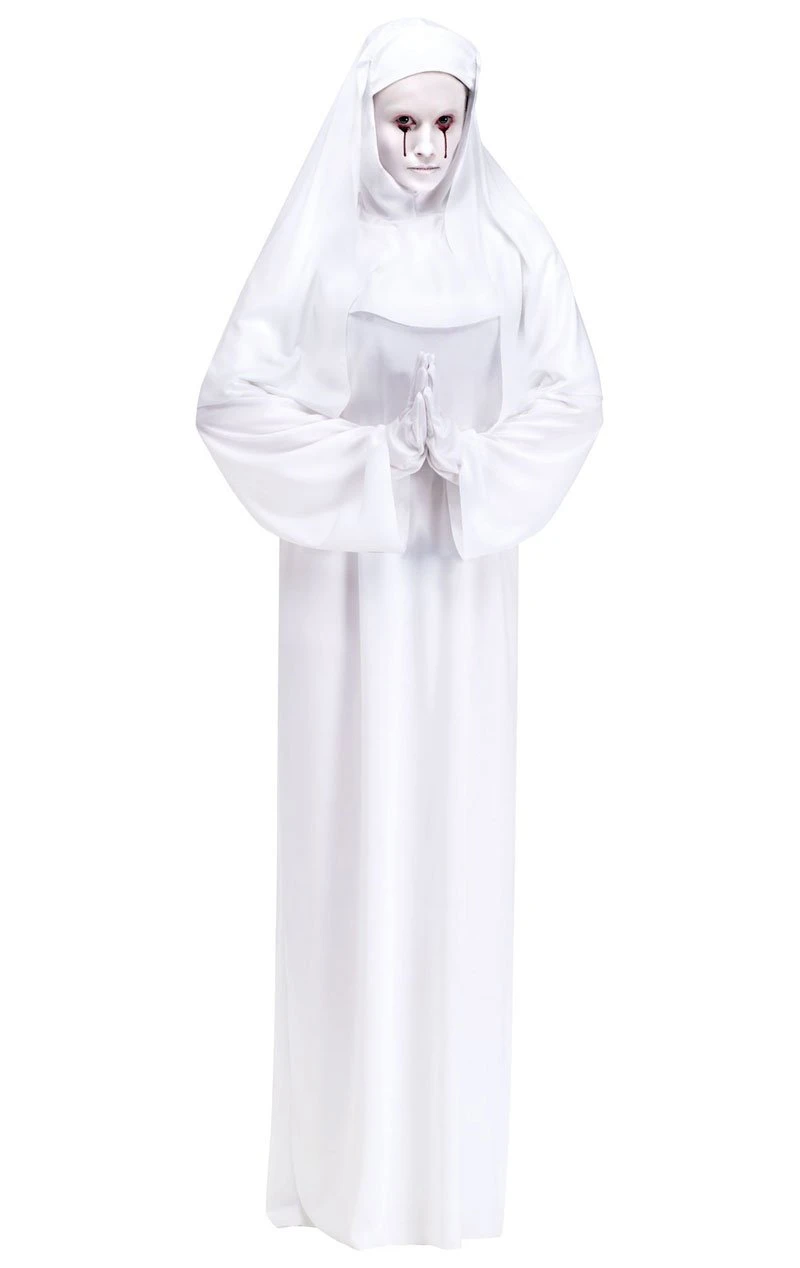 A spooky twist on a religious costume, this Halloween nun outfit includes a long white gown with wide sleeves and tie fastening at the back of the neck.