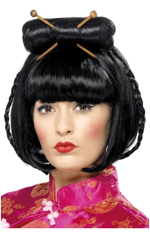 The perfect accessory for a geisha costume, this oriental lady wig is black in colour with chopstick decorations.