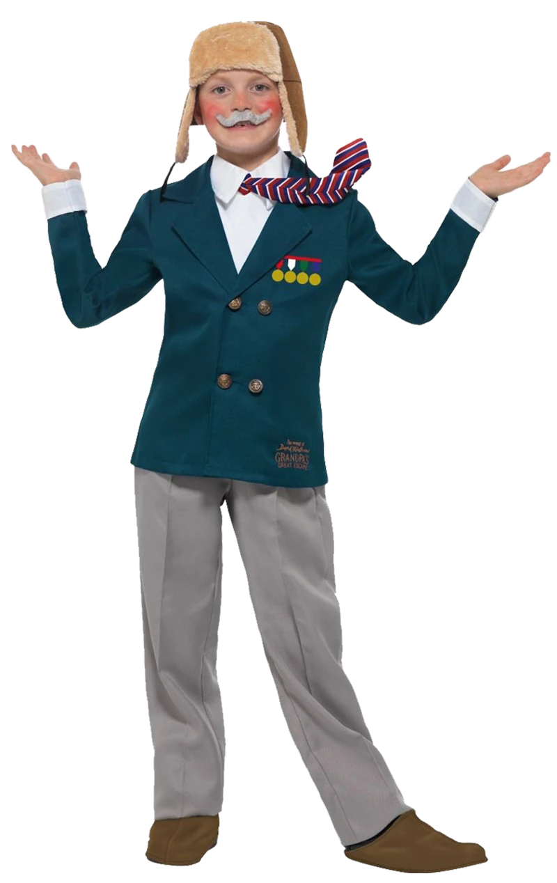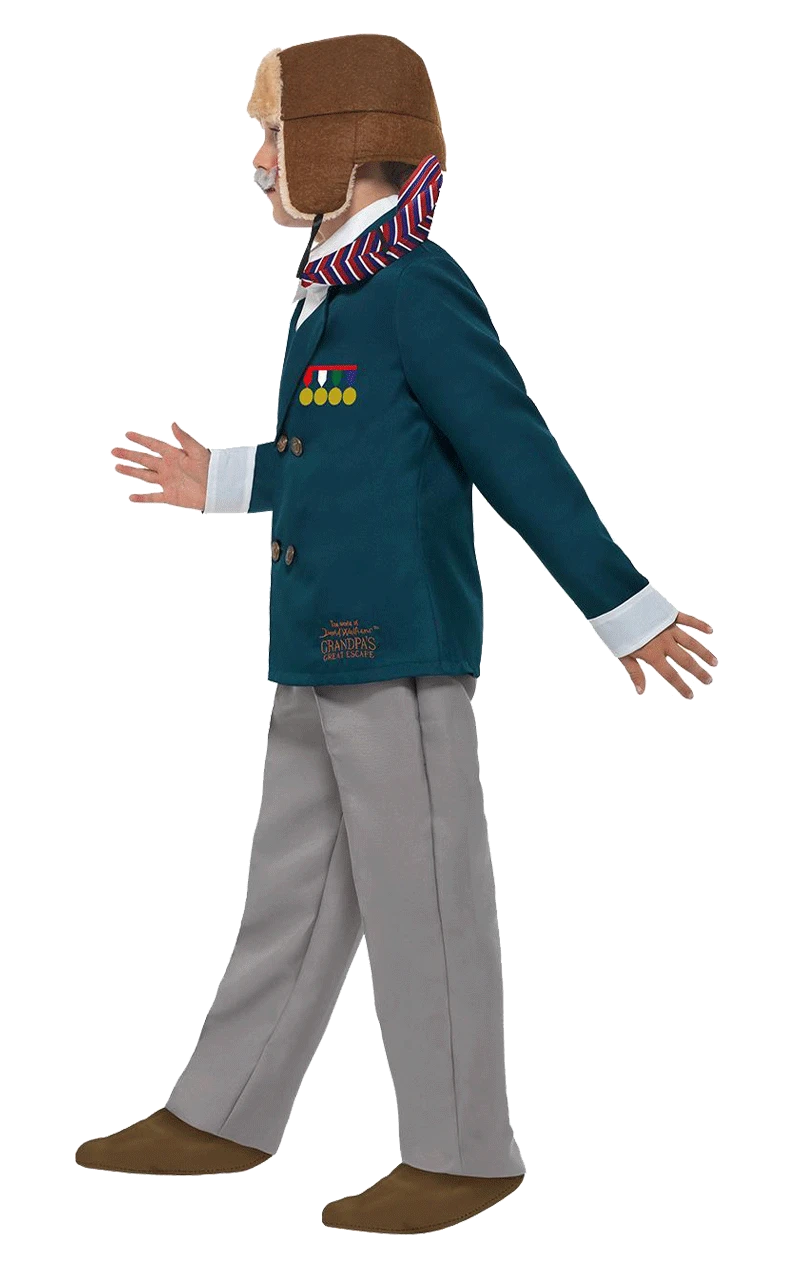 The Kids Grandpa’s Great Escape costume includes a jacket & mock shirt with tie, trousers & a moustache accessory. It also comes with Grandpa’s iconic pilot hat.