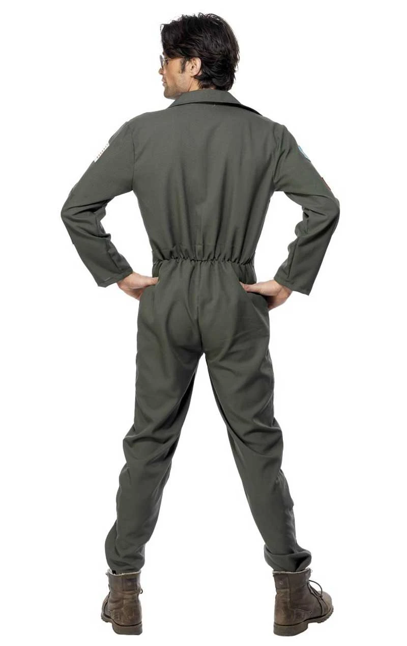 Transform into an official pilot in this Top Gun costume – a khaki green jumpsuit with fabric sew-on patch badges and a pair of dark aviator glasses to look the part.