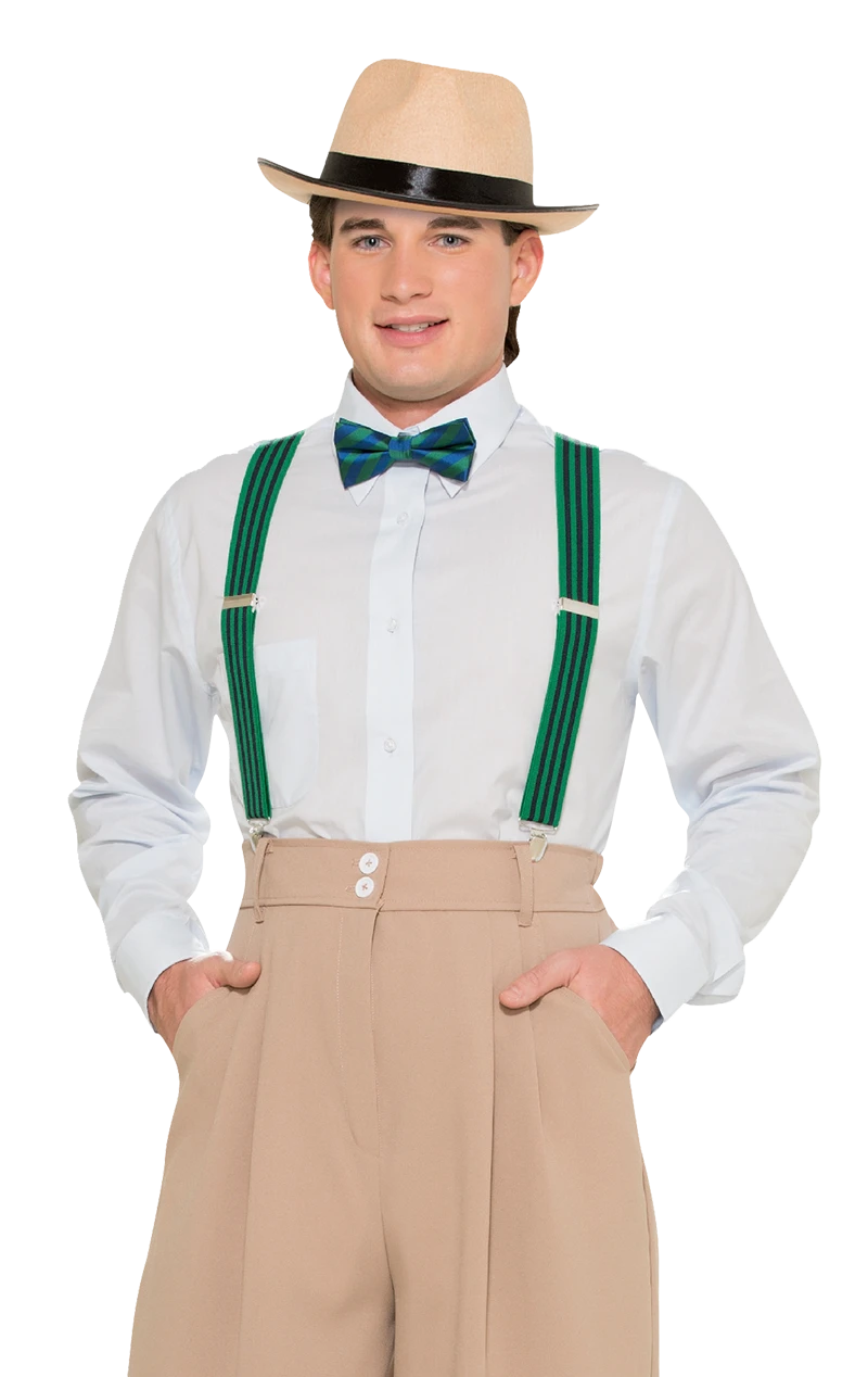 Jazz up your smart gangster zoot suit with these bright black and green striped braces. Also great when worn out boating in a roaring 20s regatta style. Alternatively, wear these Striped Green Trouser Braces with a killer clown suit for a chilling Halloween look.