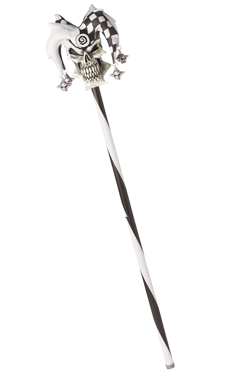 Complete your evil circus look by accessorising with this White Jester Staff Accessory! Featuring a a skeleton in a jester hat at the top, it will be sure to add a creepy feel to your costume.